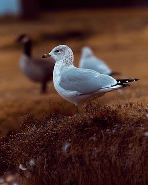 A close-up of a ring-billed gull reveals intricate feather patterns and piercing eyes, as the bird stands proudly on a weathered grass, a guardian of the shoreline. (Photographed in Lubbock, TX.) © 2023 Toby Ryan | All Rights Reserved