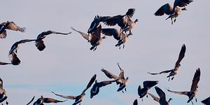 In a symphony of flight, a pair of geese soar against a canvas of cotton candy skies, leaving behind a trail of gentle ripples on the water below, a testament to the beauty of nature in motion. (Photographed in Lubbock, TX.) © 2023 Toby Ryan | All Rights Reserved
